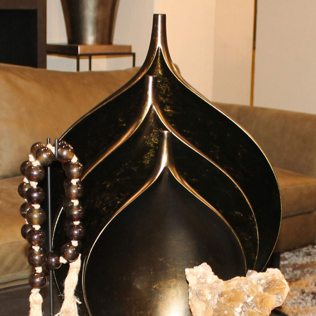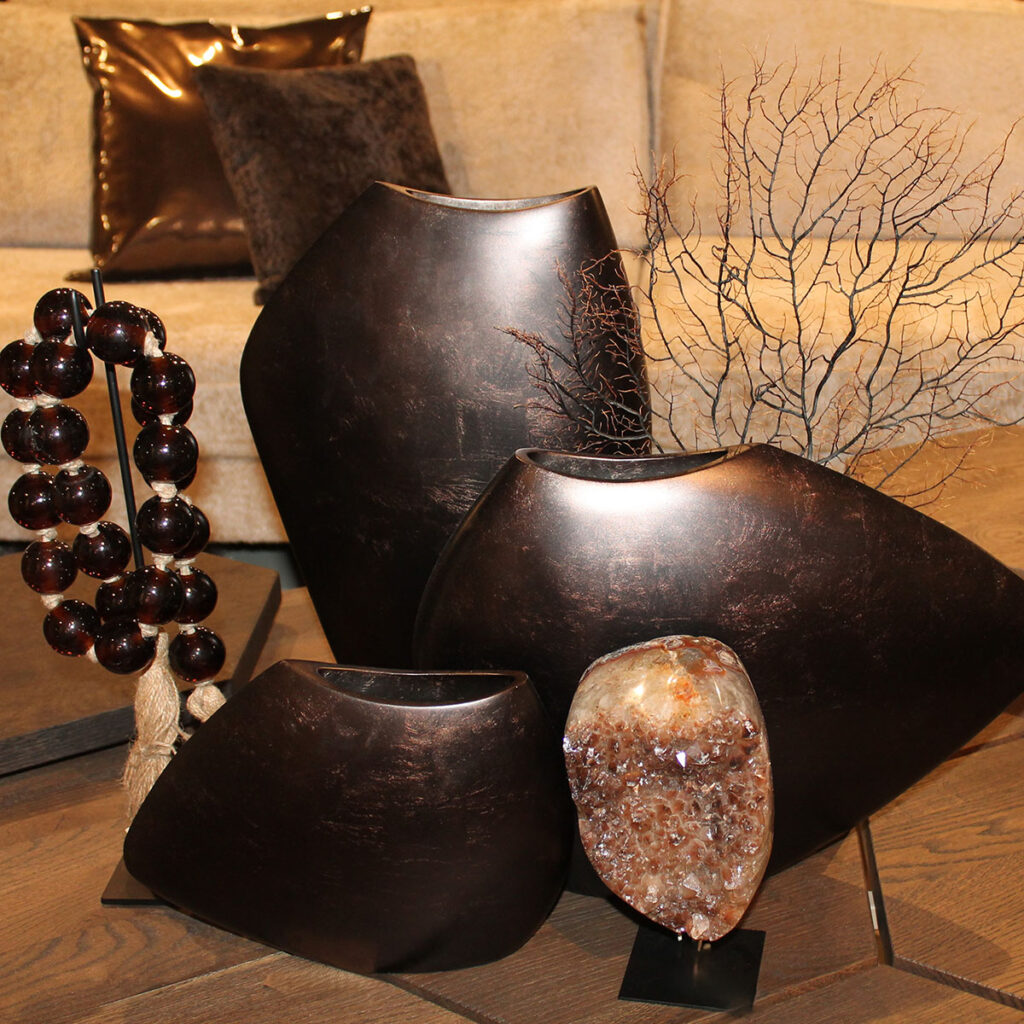 Zonder decoratie geen sfeer in private, commerciële en publieke ruimtes. Styling maakt het verschil. Stylerz blinkt uit in de Hotel Chique stijl: vooral bladzilveren woonaccessoires voor luxere interieurs. Potten, vazen, sokkels, sculpturen, schalen, kandelaars, curiosa en naturalia — de opsomming is nog lang niet compleet. Wat wel compleet is? De all-inclusive invulling/aanvulling, de ‘A en B’ formule, de mogelijkheid om het object volledig af te stylen. Een vaas dus ook bloemen en takken om erin te zetten. Een sokkel dus ook vazen, schalen en sculpturen om erop te zetten. Een display(vitrine)kastje dus ook objecten om erin te presenteren. In omgekeerde volgorde klopt die redenering ook.