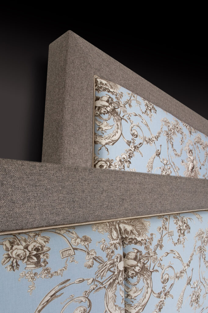 De hoofdborden Boétie en Rêveries brengen de kruisbestuiving tussen vroeger en nu haarscherp in beeld: een minimalistisch kader met een klassiek-getinte invulling. De exclusieve stofcollecties zijn ontwikkeld in samenwerking met Maison Thévenon: een Frans familiebedrijf (1908), gerenommeerd om zijn exceptionele interieurstoffen (meubels, gordijnen). De collectie Ludivine is een legendarische ‘toile de Jouy’ in traditioneel lichtblauw en roestbruin. Toile de Jouy? Deze stof gaat terug naar de 18e eeuw. Toen bedrukt met idyllische taferelen van het plattelandsleven of mythologische scènes, nu voor ‘Le Sommeil Français’ met klassieke en florale dessins geïnspireerd op het culturele patrimonium. Daar tegenover is de collectie Pondichéry uitbundiger: een decoratieve stof in flamboyante kleuren. Deze is ontworpen door Studio Inkfabrik, in eigen woorden het ‘Pariser duo aus Berlin’.