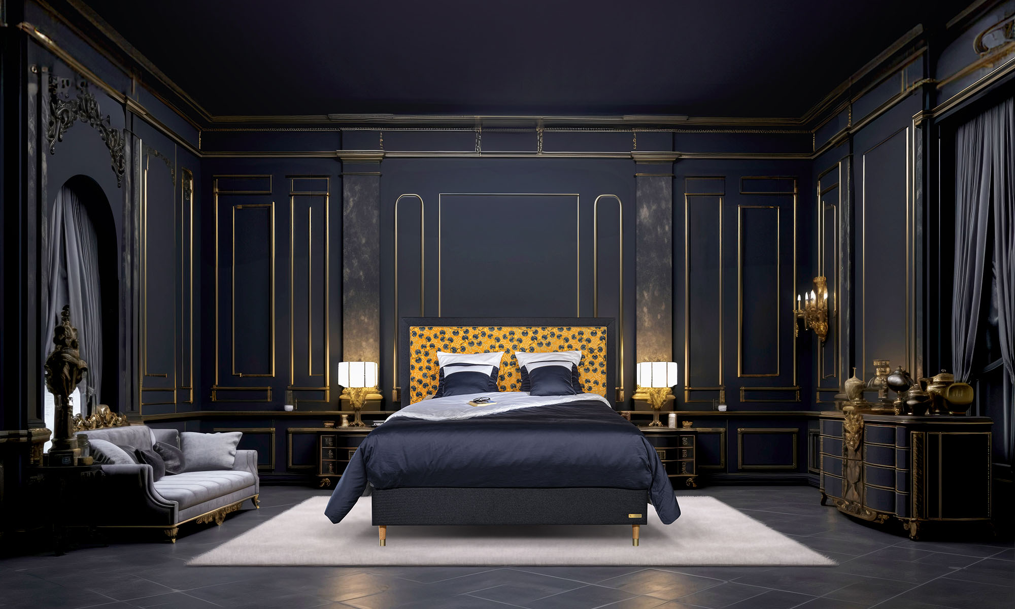 De hoofdborden en het bedlinnen dragen de gouden signatuur van ‘Le Sommeil Français’: het gouden embleem, de gouden bies.