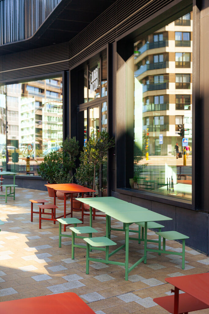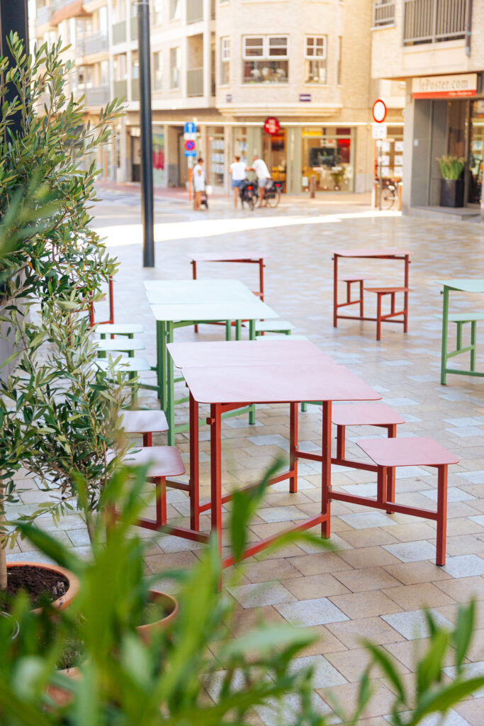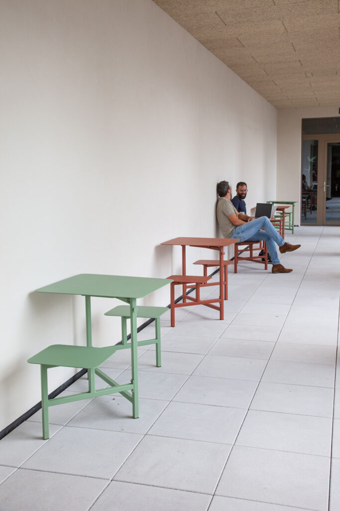 Met openbare ruimtes in het achterhoofd, werd The Duo een modulair concept. Je kunt setjes los van elkaar neerzetten en tegen elkaar schuiven tot een (meters)lange tafel. Je kijkt maar wat op dat moment het beste uitkomt. Extra horeca-handigheidjes zijn de vloerankers en de bag-buddies, een tassenhaakje onder het tafelblad, aan de poot. Tas van de grond, in het zicht, bij de hand. The Duo rekent af met een bron van ergernissen: gasten staan op en laten de stoel gewoon zo staan. Terug aanschuiven is blijkbaar een dingetje. Schots en scheve stoelen staan zo ontzettend slordig, geven zo’n onverzorgde indruk. The Duo staat er altijd netjes bij! Maakt het schoonmaken van de vloer stukken sneller. Wat dat betreft, een lifesaver voor de horeca. Voor projecten kun je het setje in je huisstijl laten uitvoeren: van de kleur tot en met je logo op The Duo en/of de bijpassende kussens.