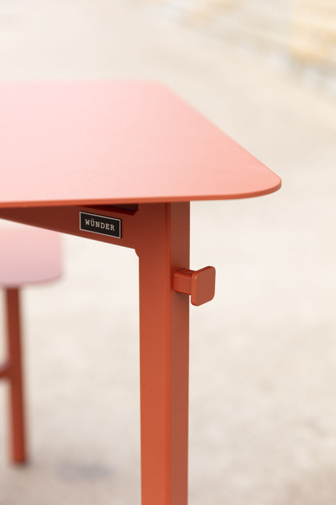 Tot hier toe ging Wünder uit van 8 -10 personen voor zijn outdoor-collecties. Tot de realiteit boven tafel kwam. ‘Smaller living speelt binnenshuis en nóg meer in buitenruimtes.’ Het concept van The Duo begon met een compact twee-in-één setje voor twee personen. Een KD-constructie van tafel-met-vaste-duozit. Gemonteerd neemt The Duo slechts 142 x 70 cm ruimte in, weegt slechts 25 kilo en staat op slechts vier poten (in plaats van twaalf). Allemaal handig! Neem je zo mee, zet je zo in elkaar, zet je zo overal neer. De constructie ligt vast, het gebruik alles behalve dat. Voor thuis, in de horeca, bij een sportveld, …