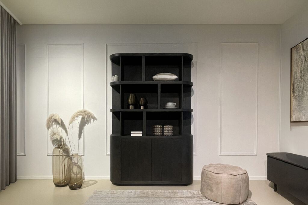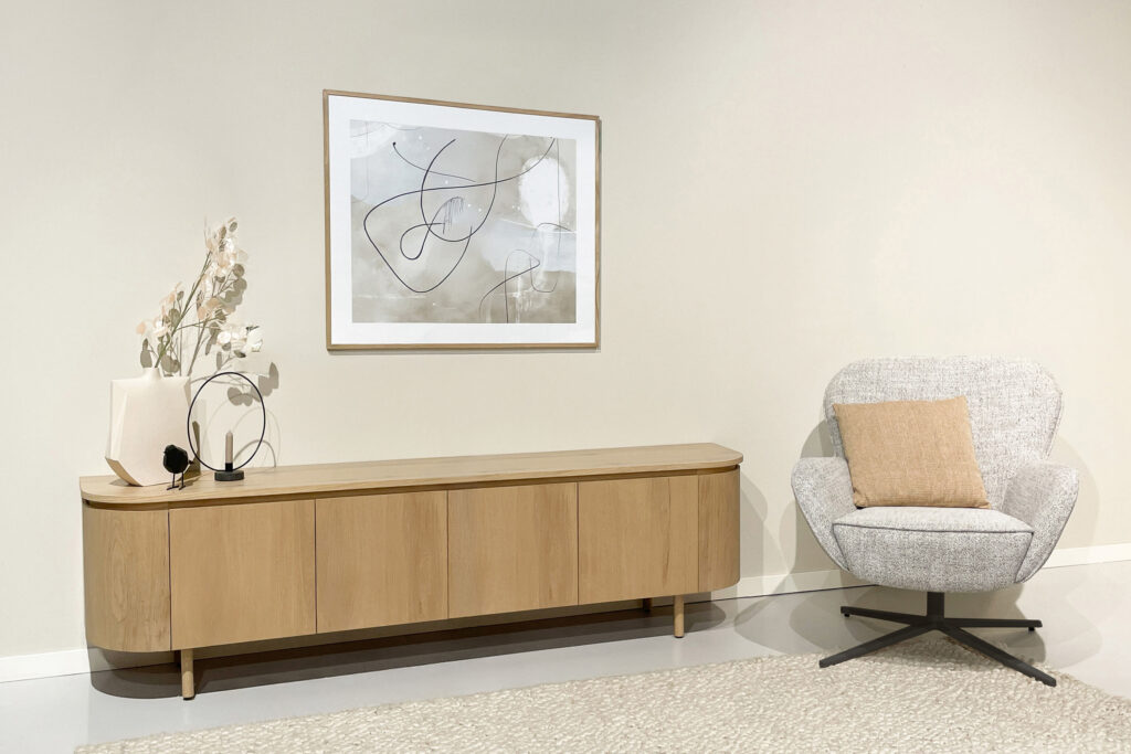 Plinten maken een ruimte af. Ze vallen op als ze er niet zijn. Ze bepalen de sfeer van het interieur en de stijl van de meubels. Lage plinten tegen de muur, hoge pootjes onder de bank en de kasten. Omgekeerd, hoge plinten tegen de muur, gesloten plinten onder de bank en voor de kasten. LivingFurn brengt voor beide plinthoogtes een passende kastcollectie in eiken fineer. De minimalistische vormgeving begint en eindigt met een afgeronde zijkant. Novero staat op een plint, Tobago op pootjes. Een bijkomend verschil is de ligging van het bovenblad: strak aansluitend dus ‘naadloos’ bij Novero, verhoogd dus ‘zwevend’ bij Tobago. De pootjes en het bovenblad geven Tobago een licht en luchtig karakter. Hier verschijnt dan ook het cumuluswolkje: gematerialiseerd in de wolkvormige salontafel. Voor zover het eiken nieuws: gestileerd organische vormen in rustige, neutrale kleuren (naturel, espresso).