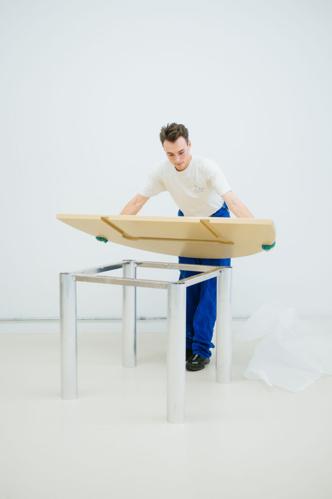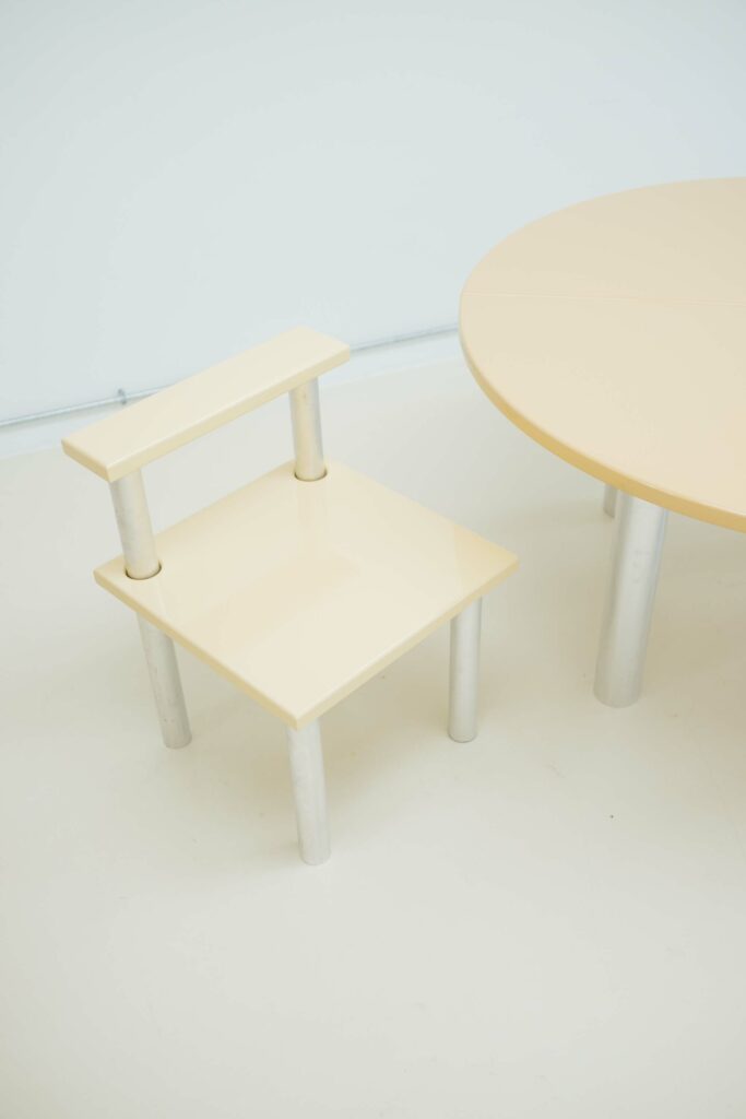 De 808-serie reflecteert een filosofisch concept: het leven kan zó eenvoudig zijn. Zelfde verhaal voor het designconcept: de meest elementaire vorm van een tafel, een stoel, een boekenrek. Ieder kind tekent vier poten en een plank. Dat beeld zit in ons collectief geheugen. ‘Een designer is geen vakman! Wat ik ontwerp, wil ik ook zelf kunnen maken. Dus keep it simple.’ Daarom werkt de 808 -serie kinderlijk eenvoudig: een aluminium buis (poten) en een houten plank (blad, zitting, rugleuning). Ook hier speelt de ‘dual balance’: de harmonie van tegenpolen in het leven, de natuur. Het matte, want onbehandelde aluminium met zijn ruwe textuur voor de verticale staanders. Het high-glossy hout voor de horizontale, rondom afgeronde planken. Stel je voor: met acht (!) lagen gelakt en tussendoor gepolijst. Resultaat: zo spiegelglad en weerspiegelend als premium gecoat metaal. Die optisch zwevende planken lijken los van de staanders te hangen. De alu-buizen steken perfect gecentreerd door de uitsparing in de planken. Een onzichtbare koker en verdeelplaatje houden alles op zijn plaats. Bij de stoel valt de horizontale rugleuning op: zit op dezelfde hoogte als het blad van de eettafel, werkt als armsteun, bijzet- en en aanschuiftafeltje. Eén stoel is je persoonlijke verlengstukje aan de tafel. Meerdere stoelen bij elkaar vormen een kring. Je zit (on)gewoon relaxed op de stoel: min of meer zijwaarts, lekker casual. Jord is een kind van deze tijd.