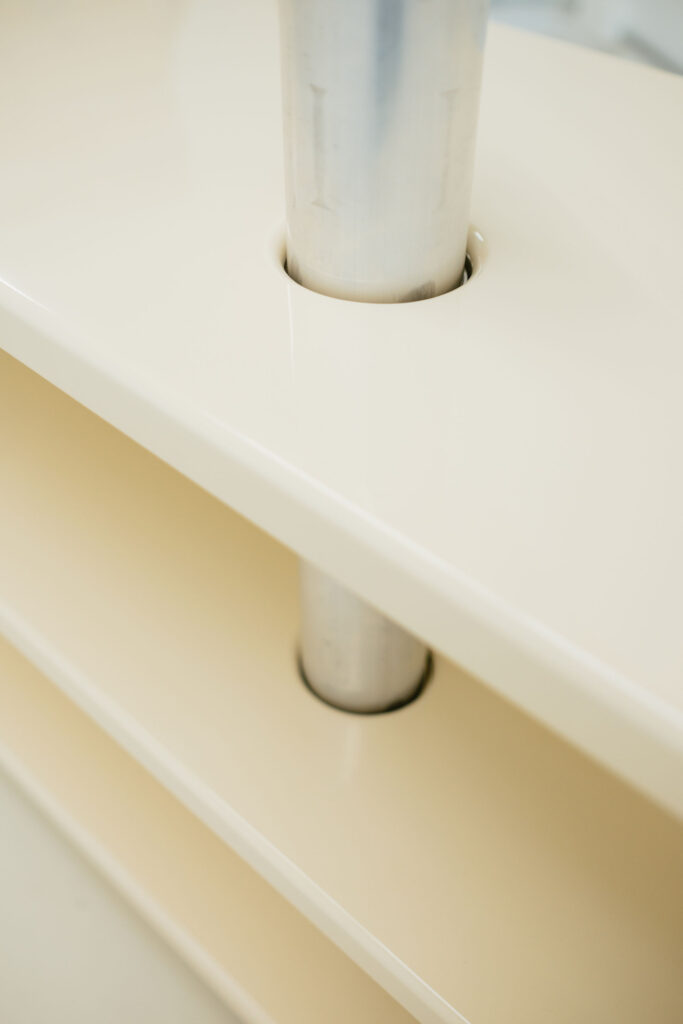 Het chroom van zijn jeugd heeft plaatsgemaakt voor aluminium – in combinatie met een highgloss finish, hoe dan ook. ‘Een reflecterende afwerking heeft twee voordelen: daglicht dringt verder de ruimte in; het object dringt zich niet op, want gaat op in zijn omgeving.’